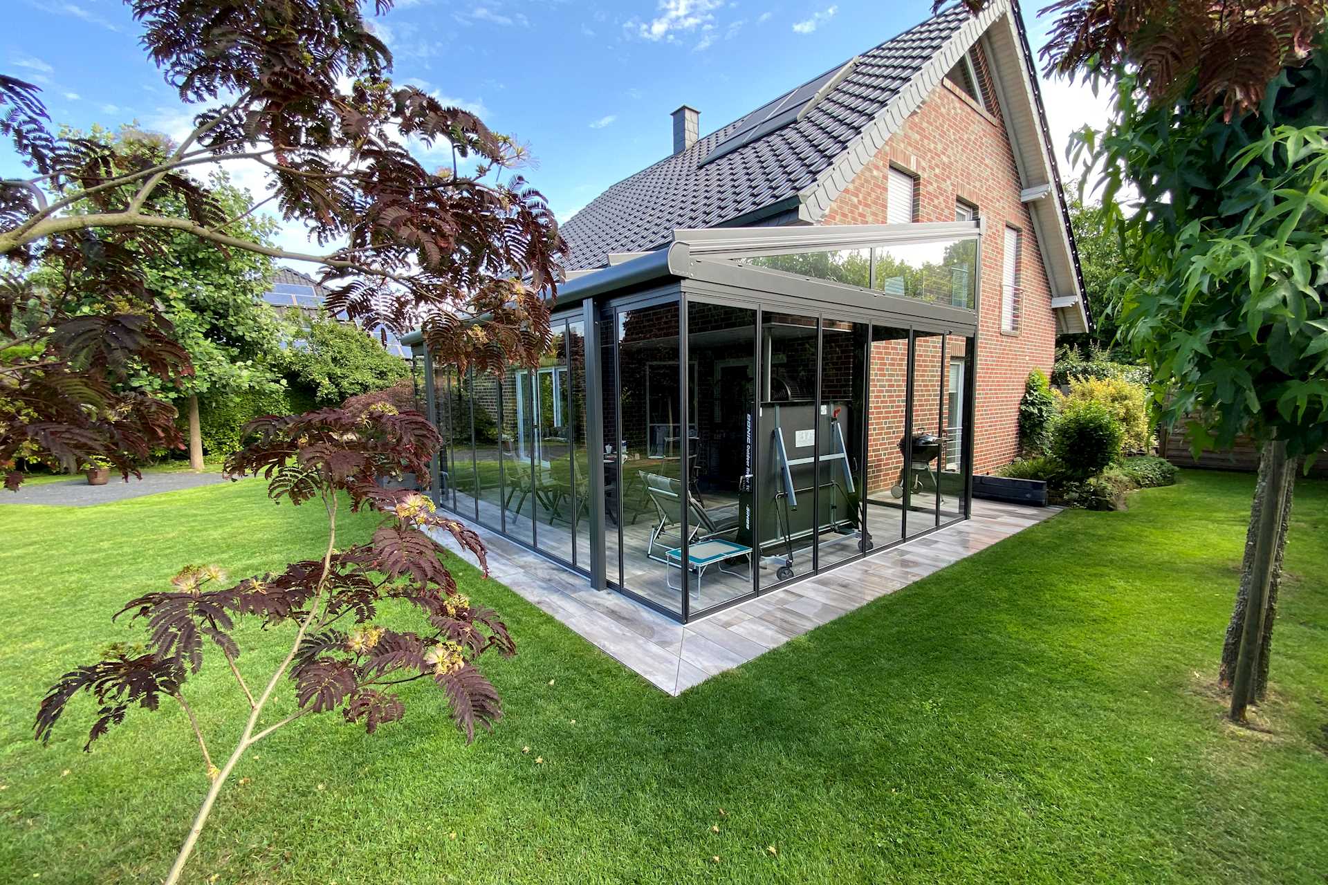 Bu proje, iç ve dış mekân arasında güçlü bir bağ kuran, geniş açıklıklara sahip cam atrium olarak tasarlanmıştır. Tam açılabilir cam yüzeyler sayesinde yaşam alanı bahçe ile bütünleşirken, ferah ve akışkan bir mekân deneyimi sunar.