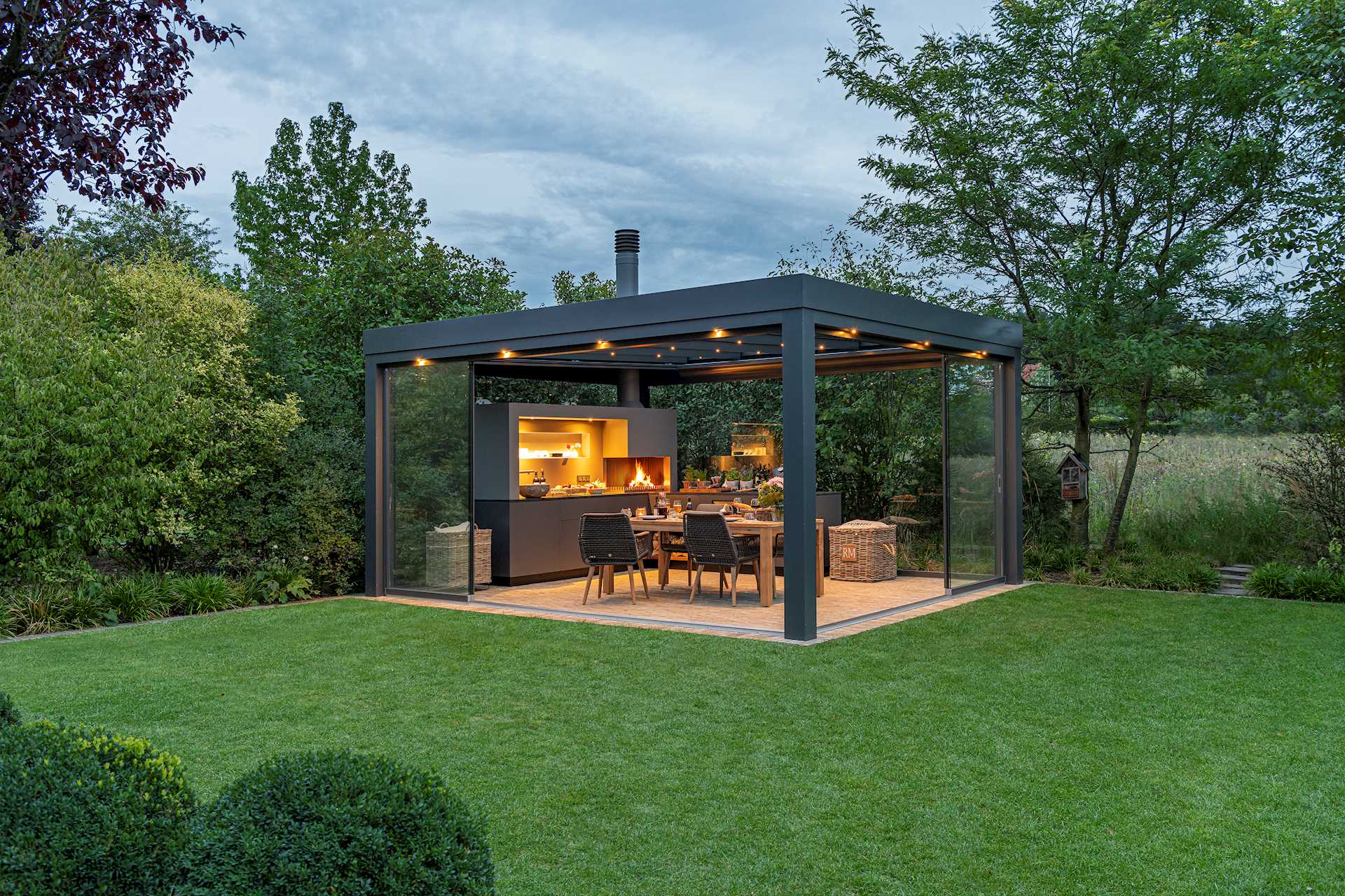 Outdoor mutfak, cam yapı ile bütünleşik şekilde konumlandırılarak hem estetik hem de fonksiyonel bir kullanım sunar.
